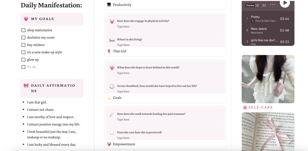 The Wonyoungism Manifestation Journal is a soft, aesthetic Notion template designed to help you step into your main character energy. Inspired by Wonyoung’s elegance and confidence, this journal includes sections for daily manifestations, goal tracking, empowering affirmations, and deep reflection prompts to boost productivity and self-awareness. With a gallery-style yearly planner and a dreamy layout, it’s perfect for anyone looking to stay organized while embracing a graceful, glowing lifestyle. Whether you’re leveling up your routines or just romanticizing your everyday life, this template makes becoming that girl feel effortless and intentional.