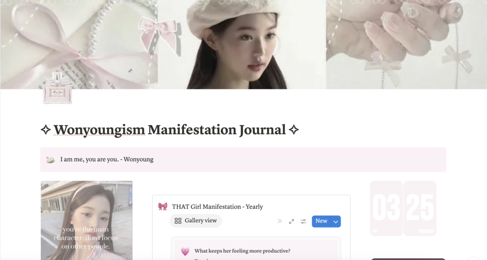 The Wonyoungism Manifestation Journal is a soft, feminine Notion template designed to help you stay productive, set goals, and manifest your dream life—all with main character energy. Perfect for anyone embracing self-growth with elegance.