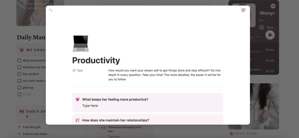 The Wonyoungism Manifestation Journal is a soft, feminine Notion template designed to help you stay productive, set goals, and manifest your dream life—all with main character energy. Perfect for anyone embracing self-growth with elegance.